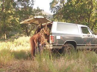 Nackte Frau wird im Freien von einem muskulösen Mann gefickt
